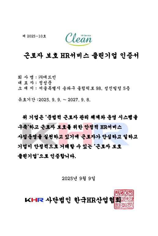 애드민은 품질, 환경, 안전보건 전 분야에서 ISO 인증을 완료하였으며, 중소벤처기업부의 경영혁신형 중소기업(Main-Biz) 확인 및 여성가족부의 가족친화인증을 보유한 검증된 기업입니다. 특히 국내 대표 식품 기업 A사와 글로벌 뷰티 기업 B사 등 유수의 기업들이 10년 넘게 애드민과 함께하는 이유는 바로 이러한 리스크 관리의 안정성 때문입니다